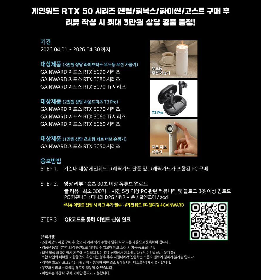 이와 더불어 2026년 4월 1일 부터 4월 30일 오후 3시까지, 디앤디컴이 유통하는 게인워드 GeForce RTX 50 시리즈 지포스 그래픽카드 구매자를 대상으로 제품 구매 리뷰를 등록하면 최대 3만원 상당의 경품을 증정하는 프로모션을 진행한다고 밝혔다. 이벤트 기간 내에 디앤디컴이 유통하는 대상 게인워드 그래픽카드 단품 및 그래픽카드가 포함된 PC를 구매하고 응모방법에 게재된 절차에 따라 정보 입력 및 등록을 진행하면 된다.