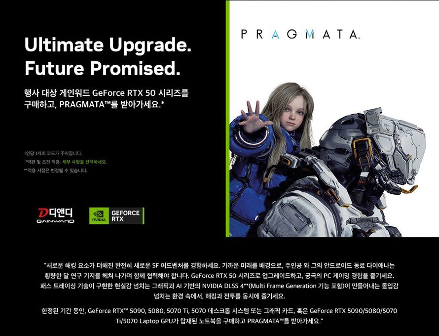 이번 프로모션 대상은 게인워드 지포스 RTX 5090, RTX 5080, RTX 5070 Ti, RTX 5070 시리즈 단품 그래픽카드 또는 해당 그래픽카드가 장착된 완제 PC 구매 고객이다. <프래그마타> 번들 프로모션 참여를 위해서는 이벤트 기간 내 대상 제품을 구입 후 디앤디컴 이벤트 메일로 제품에 관한 정보 및 인적 사항을 등록하면 프로모션 진행 담당자가 확인 후, 고객에게 게임 코드를 이메일로 발송하며, 고객은 NVIDIA APP을 통해 리딤 코드를 등록하면 게임 등록 절차는 완료된다. 또한, 게임 코드는 1인당 1개만 제공되며, 한정 수량으로 준비된 게임 코드가 모두 소진될 경우 본 행사는 조기에 종료될 수 있음을 참고 바라며, 코드 인증 마감 시한인 2026년 6월 9일까지 리딤을 진행하지 않은 코드는 별도로 보상되지 않는다.