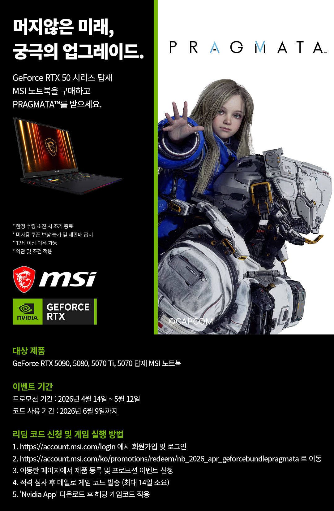 엠에스아이코리아는 NVIDIA GeForce RTX™ 50 시리즈 그래픽을 탑재한 MSI 노트북 구매 고객을 대상으로 캡콤의 신작 <프래그마타> 게임 코드를 증정하는 프로모션을 진행한다고 밝혔다.