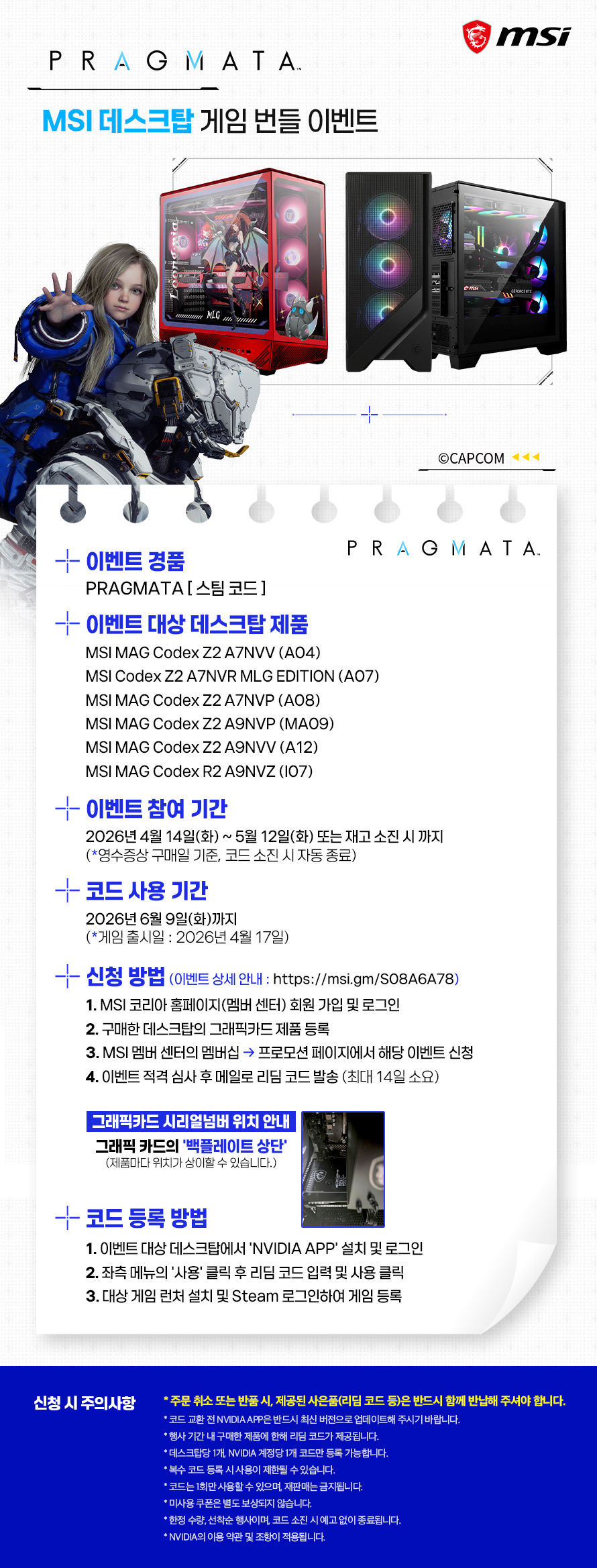 엠에스아이코리아는 지포스 RTX 5090, 5080, 5070 Ti, 5070 그래픽카드를 탑재한 MSI 게이밍 데스크탑 구매 고객을 대상으로 캡콤의 신작 <프래그마타> 게임 코드를 증정하는 프로모션을 진행한다.