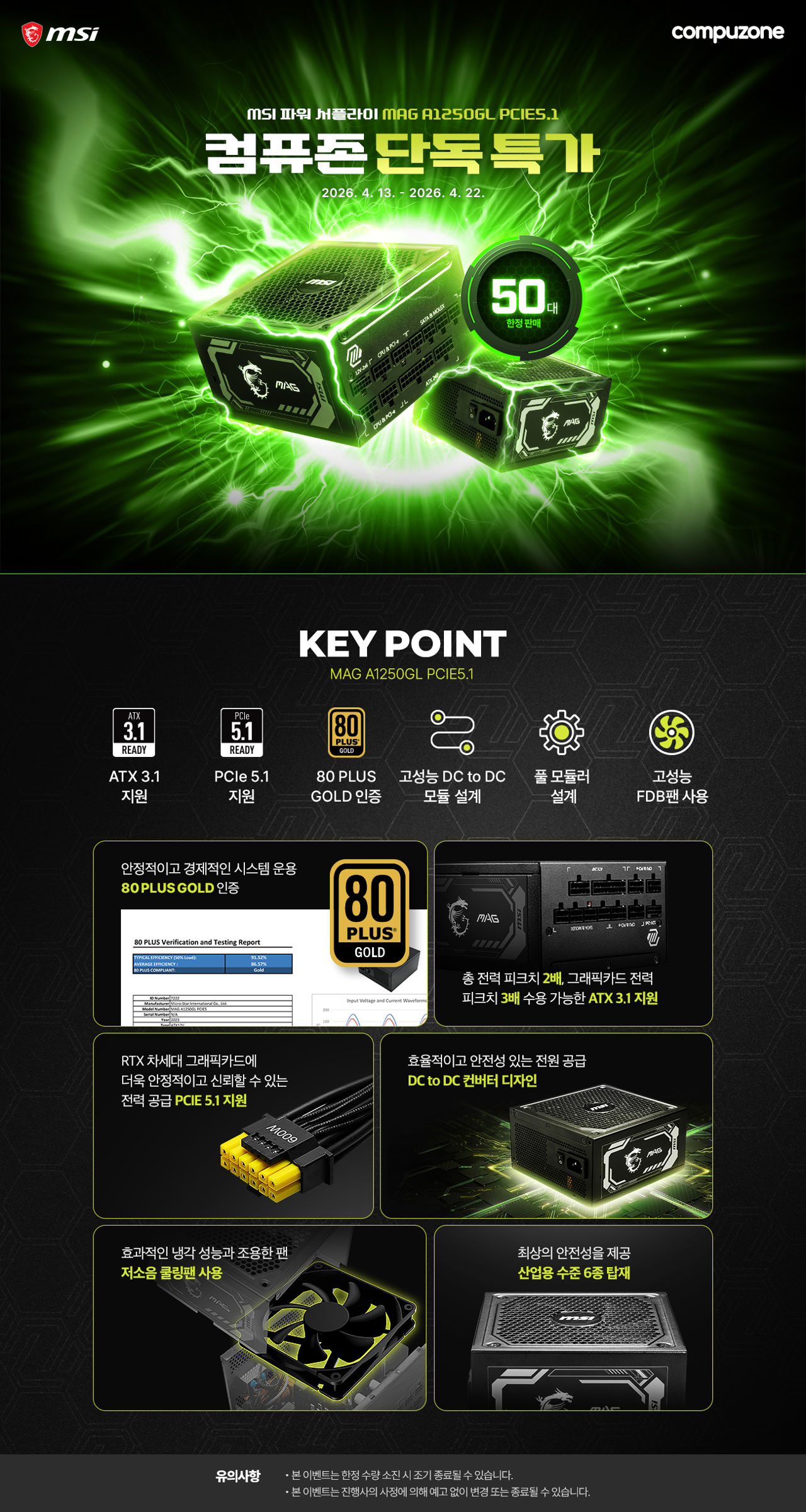 MSI 코리아 관계자는 "최신 고사양 PC 시스템을 구성하려는 고객들이 합리적인 가격에 최상급 파워 서플라이를 경험하실 수 있도록 이번 컴퓨존 단독 특가를 기획했다"며, "고사양 그래픽카드를 안정적으로 지원하는 1250W 고출력 파워를 파격적인 혜택으로 만나보시길 바란다"고 전했다.