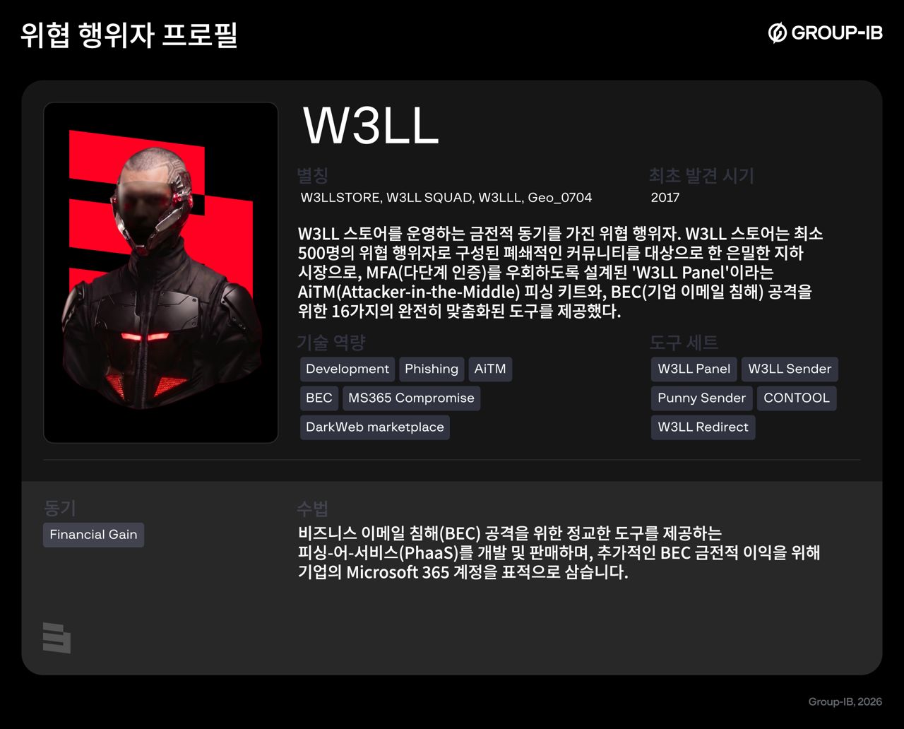 2023년 9월 Group-IB에 의해 최초로 발견된 이 조직은 2017년부터 활동해 온 것으로 추정되며, W3LL은 피싱-어-서비스(PhaaS) 플랫폼을 개발 및 운영하여 500명 이상의 사이버 범죄자들이 금융 서비스, 의료, 제조, IT, 법률 분야를 포함한 다양한 산업 분야의 기업을 대상으로 BEC(기업 대상 이메일 사기) 공격을 수행할 수 있도록 지원했다. 이러한 공격으로 전 세계적으로 수백만 달러에 달하는 금전적 손실이 발생했다.