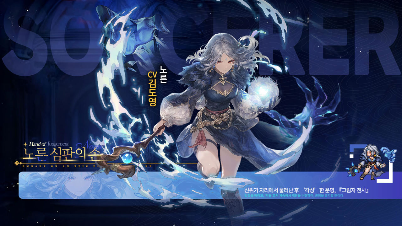 이번에 반영된 대규모 업데이트를 통해 <미송자의 노래> 전장에 정식 합류한 SSR 등급 마법사 영웅 노른은 선과 악의 경계를 넘어서 빛과 어둠의 균형을 조율하는 냉혹한 심판자 콘셉트의 캐릭터이다.