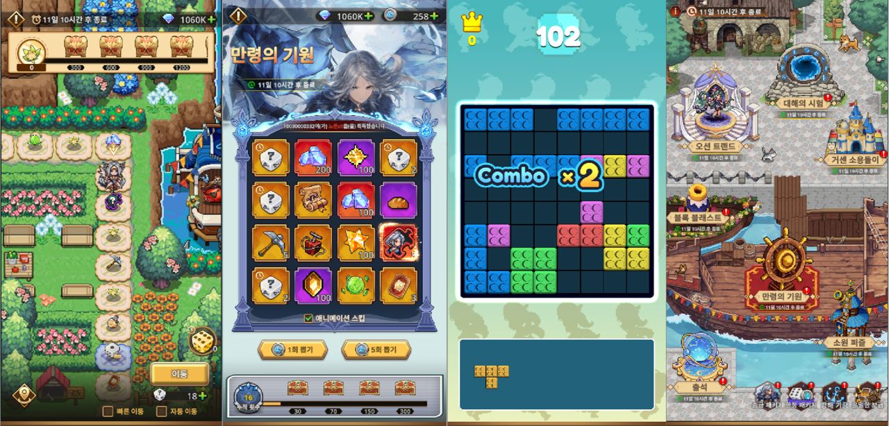 이외에도 강력한 해역의 지배자 '샤크 티라노'에 도전하는 '대해의 시험', 퍼즐 미션을 통해 조각을 모아 한정 코스튬을 획득할 수 있는 '소원 퍼즐', 그리고 간단한 블록 맞추기 방식의 '블록 블래스트' 등 다양한 이벤트 콘텐츠가 마련되어 풍성한 보상을 제공한다.