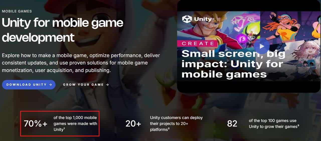 ▶ 모바일게임 상위 1000개 중 70% 이상이 유니티 기반 제작임을 알리는 공식 홈페이지 설명. (출처: 유니티 공식 홈페이지)