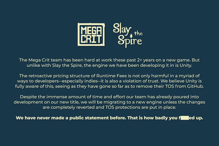 ▶ 유니티의 런타임 요금 정책을 강하게 비판한 메가크리트.