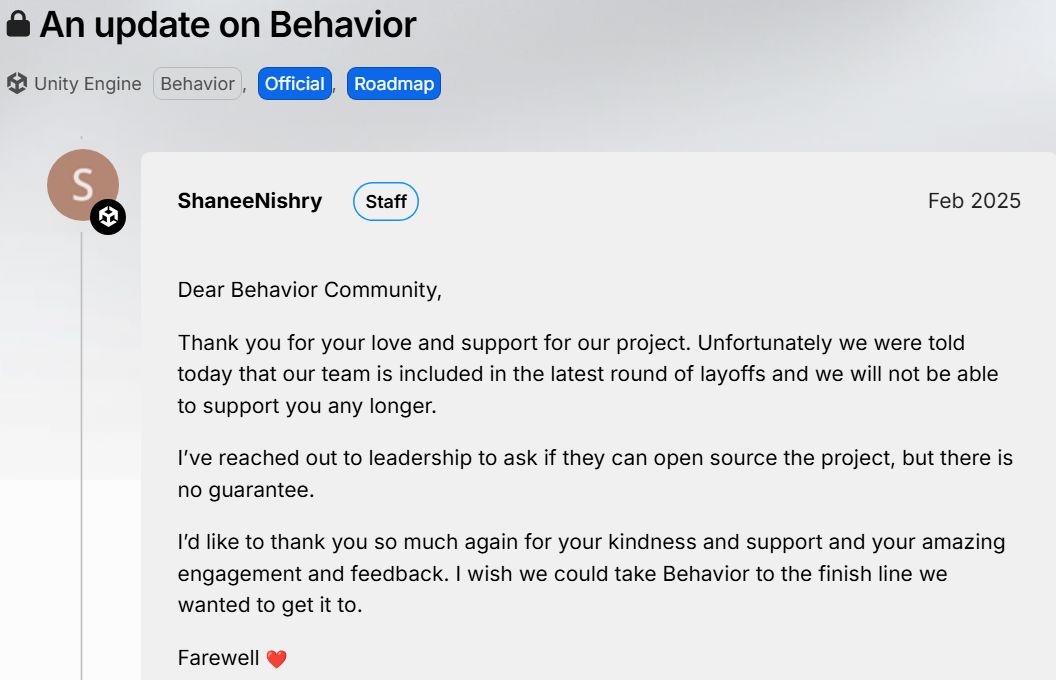 ▶ 유니티 커뮤니티 포럼에 Behavior 팀 전체 해고 소식을 알린 한 직원의 게시물.