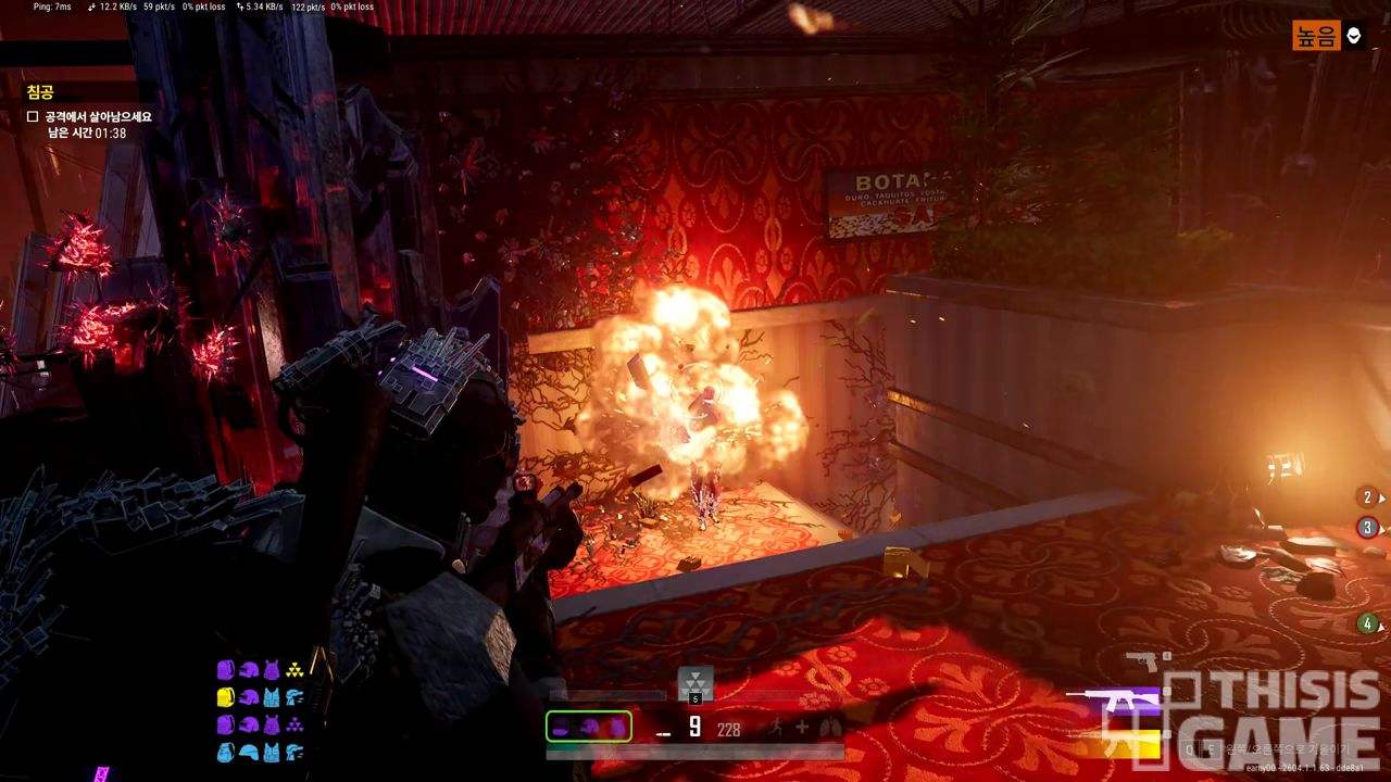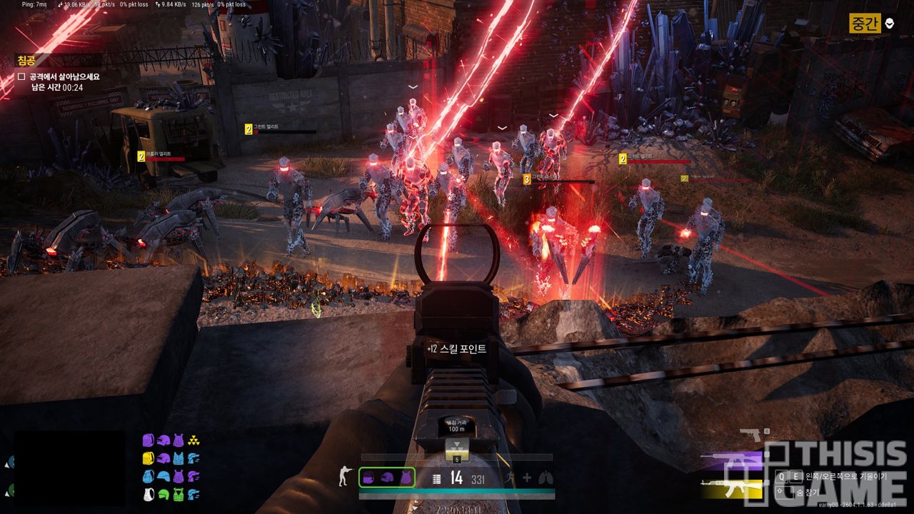 예를 들어, 침착함과 정교함이 강조되는 <배틀그라운드>의 전투는 게임의 독보적 아이덴티티 중 하나다. 그런데 <제노포인트>의 전투는 4인 코옵 슈터의 일반적 문법을 답습해 수없이 쏟아지는 적을 지워 나가야 하는 형태다. 이 때문에 <배틀그라운드>의 전투가 주는 고유의 템포와 스릴을 거의 느낄 수 없고, 대신 신속하고 파괴적인 난사로 게임을 꾸려 나가야 한다.