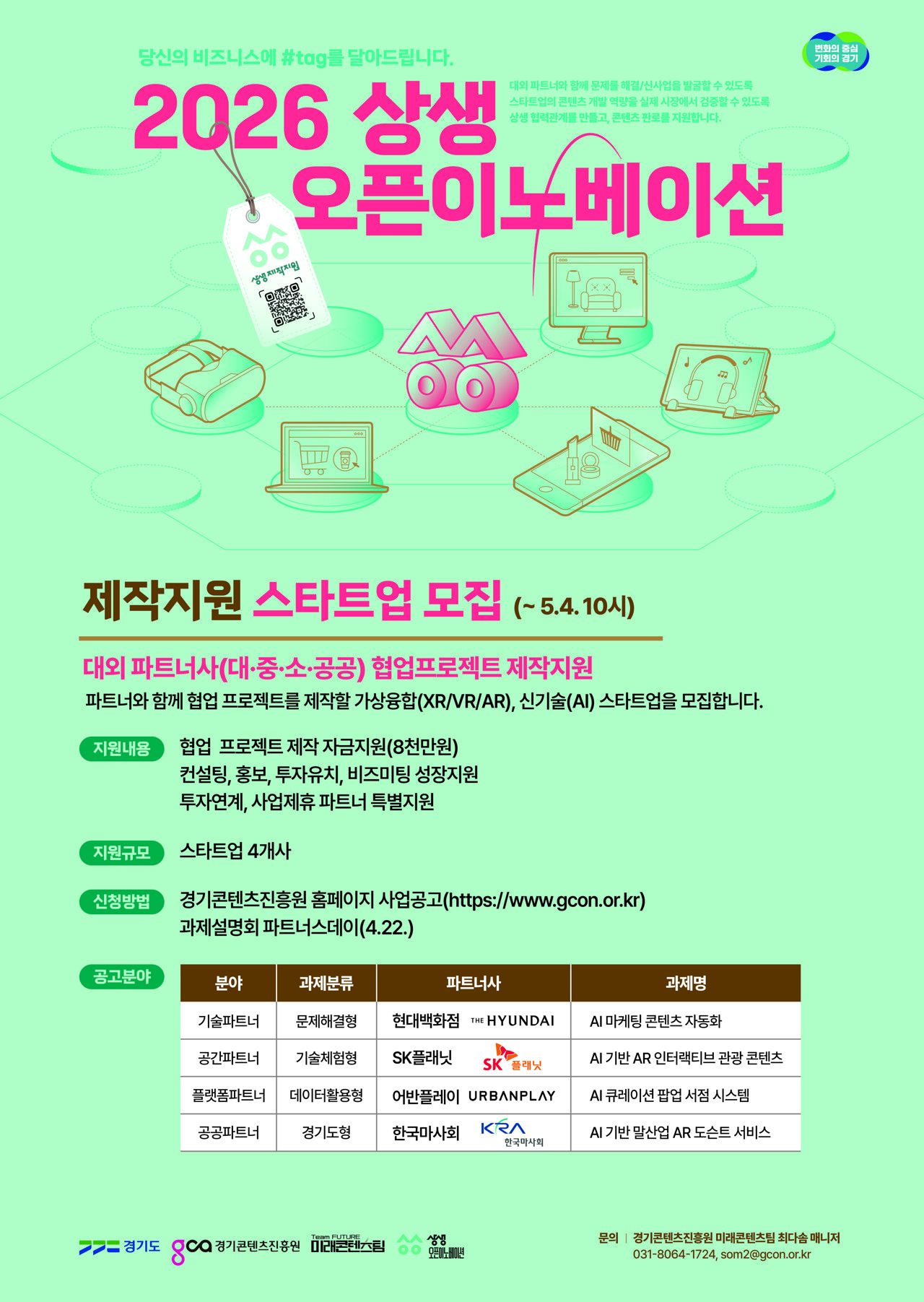 경기도와 경기콘텐츠진흥원은 도내 유망 스타트업과 대·중견기업 간의 협업을 통해 실질적인 판로 개척을 지원하는 <2026 상생 오픈 이노베이션> 제작 지원 사업에 참여할 기업 4개 사를 오는 5월 4일 오전 10시까지 모집한다.