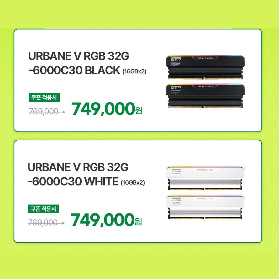 이번 프로모션은 아싸컴에서 기획한 행사용 하이엔드 PC를 구매할 경우 시스템에 탑재된 클레브 어베인 V RGB 메모리에 대한 할인 쿠폰이 결제 단계에서 자동으로 적용되는 방식이다. 행사 대상 메모리는 6000MHz 동작 클럭과 CL30 램 타이밍을 지원하는 32GB 용량 듀얼 패키지 구성으로 고성능 시스템에 적합한 퍼포먼스를 제공하며 뛰어난 쿨링 솔루션을 갖춘 알루미늄 방열판을 장착해 쾌적하고 안정적인 성능을 유지한다.