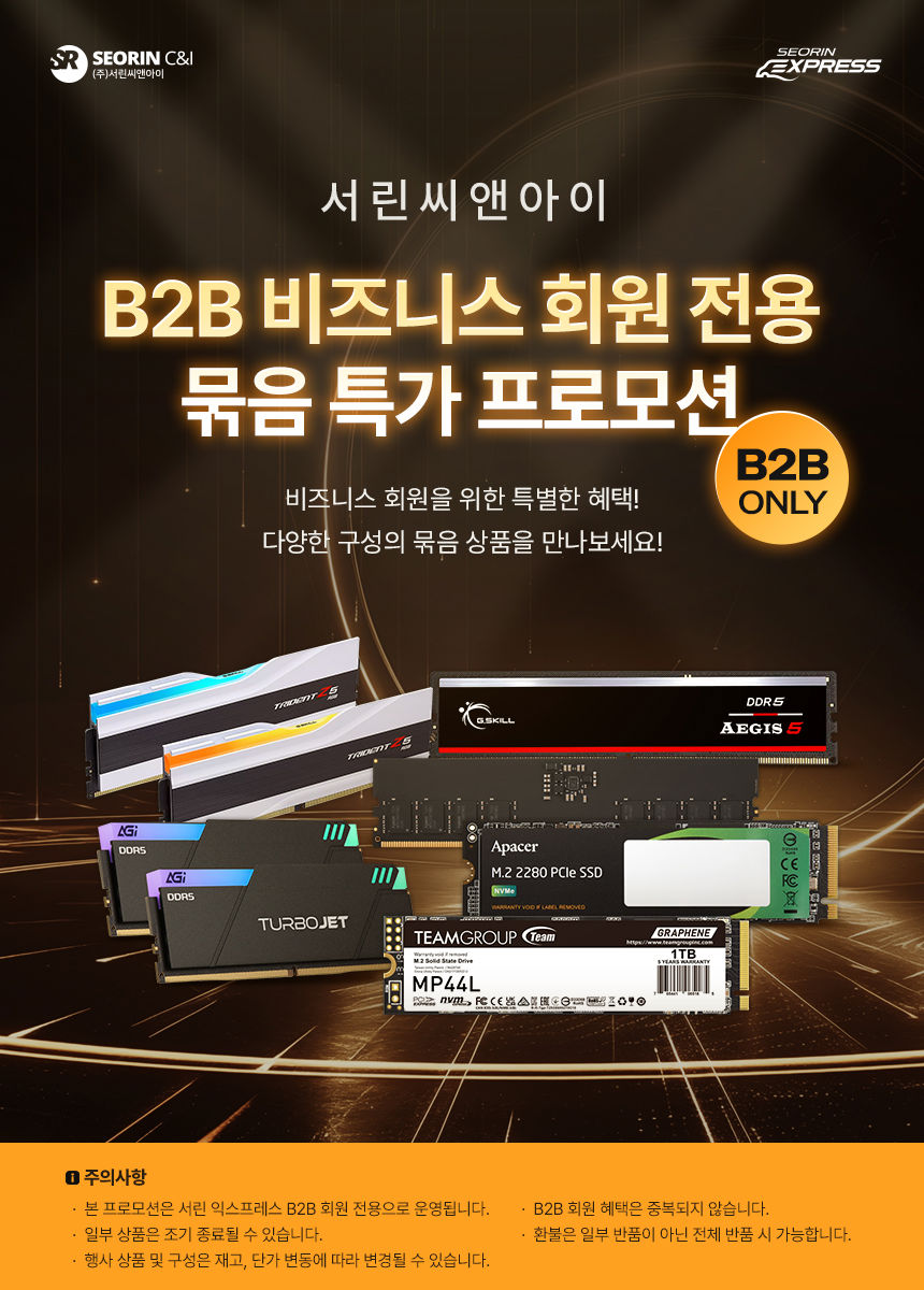 서린씨앤아이는 이번 메모리와 SSD 조합을 시작으로 묶음 상품의 구성을 점진적으로 확대해 나갈 계획이다. 향후 PC 케이스와 쿨러를 결합하는 등 시장 트렌드에 맞춘 다채로운 라인업을 지속적으로 추가해 비즈니스 회원들의 시스템 빌드 효율을 더욱 높일 예정이다. 다만 이번 프로모션에 적용되는 묶음 특가는 B2B 비즈니스 회원에게 상시 제공되는 기본 할인 혜택과 중복으로 적용되지 않는다.