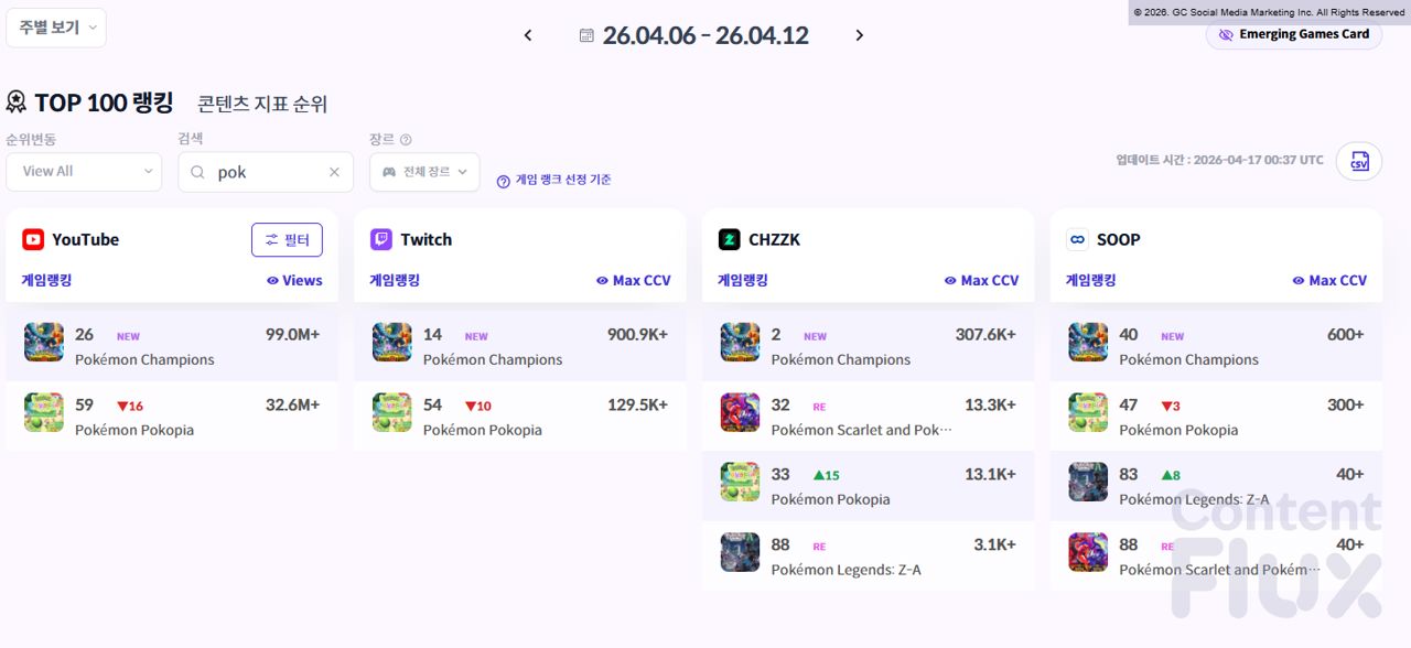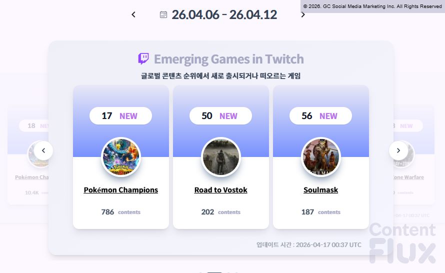 4월 2주차(4월 6일~12일), <포켓몬 챔피언스>는 ContentFlux가 선정하는 트위치 'Emerging Games' 차트에 17위 NEW로 신규 진입하며 786개의 콘텐츠를 기록했습니다. 같은 기간 신규 진입한 <로드 투 보스토크>(50위, 202개), <소울 마스크>(56위, 187개)와 비교할 때, 포켓몬 IP의 팬덤이 즉각적인 콘텐츠 생산으로 이어졌음을 보여주는 수치입니다.
