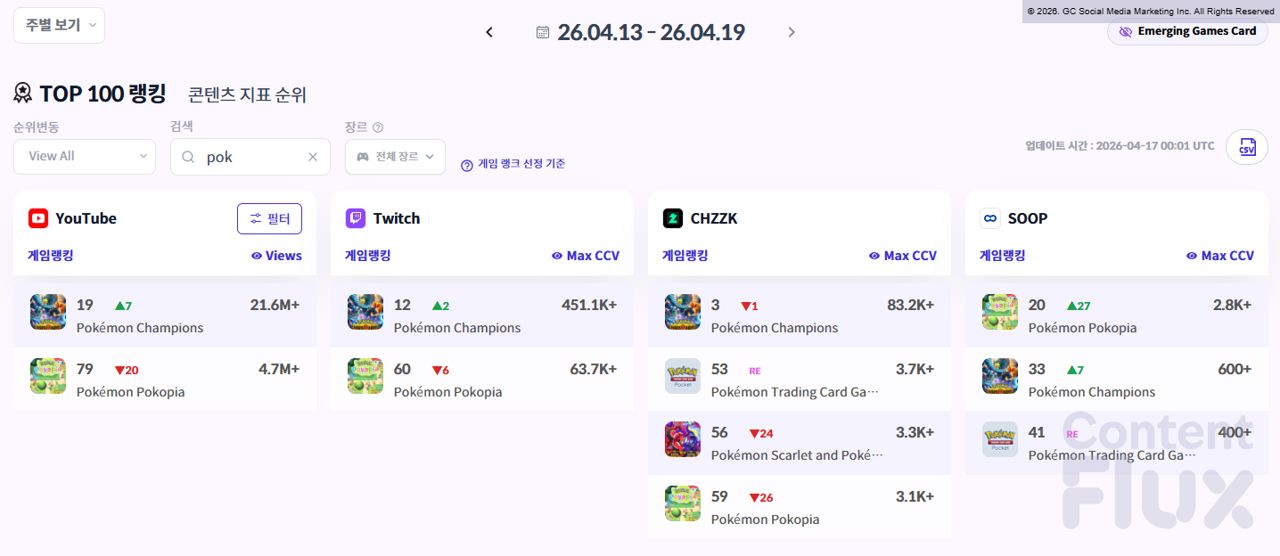 특히 치지직 전체 2위는, 국내 포켓몬 팬덤이 얼마나 집중적으로 이 게임을 소비했는지를 단적으로 보여줍니다. 4월 3주차(4월 13일~19일)에도 유튜브 19위(▲7, 2,160만 회+), 트위치 12위(▲2, 최고 동시 시청자 45만 1,100명+)로 상승세를 이어갔으며, 치지직은 3위(8만 3,200명+), 숲은 33위(▲7)로 국내 반응이 더 넓게 퍼지는 모습을 보였습니다.