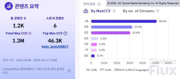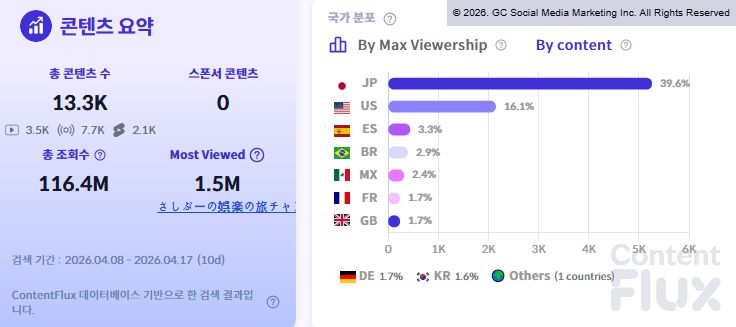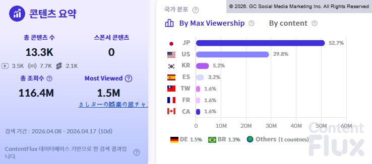 4월 8일부터 17일까지 10일간 집계된 유튜브 데이터에 따르면 총 콘텐츠 수는 1만 3,300개(영상 3,500개, 숏츠 7,700개, 라이브 2,100개), 총 조회수는 1억 1,640만 회를 기록했습니다. 가장 높은 조회수를 기록한 단일 영상은 일본 채널 'さしがーの娯楽の旅チャ'의 콘텐츠로 150만 회를 돌파했습니다.