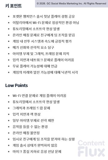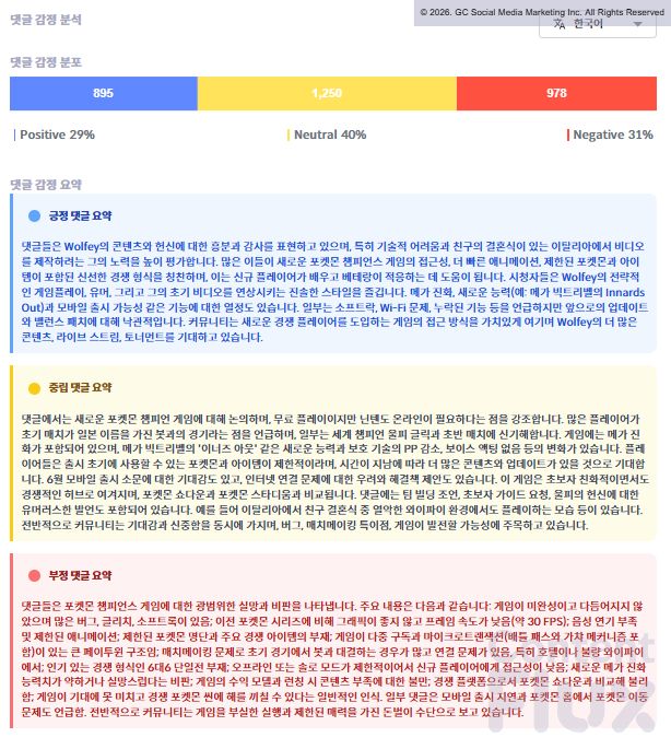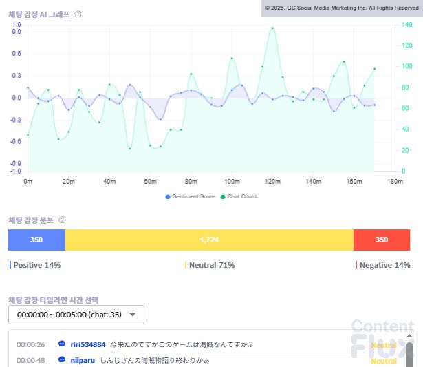다만 복잡한 게임 규칙과 UI 내 정보 부족으로 인한 혼란도 드러났으며, 채팅 감정 분포는 긍정 14%, 중립 71%, 부정 14%로 시청자 대부분이 아직 게임을 학습하며 판단을 유보하는 단계임을 보여주었습니다.