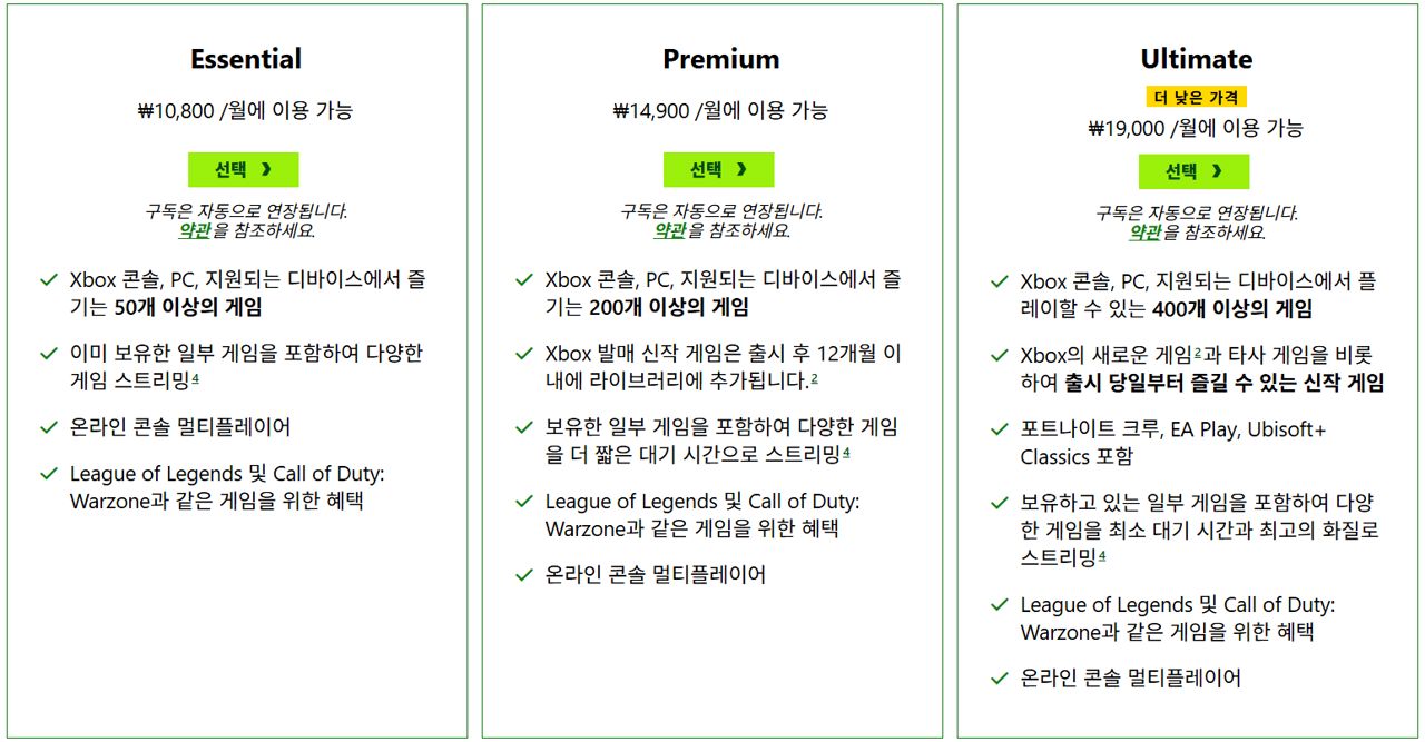 마이크로소프트는 22일 게임패스 얼티밋의 월 구독료를 2만 9,000원에서 1만 9,000원으로, PC 게임패스는 1만 8,000원에서 1만 5,500원으로 각각 인하한다고 밝혔다. 에센셜(1만 800원)과 프리미엄(1만 4,900원) 요금제는 기존 가격을 유지하며, 이번 조정은 당일부터 즉시 적용된다.