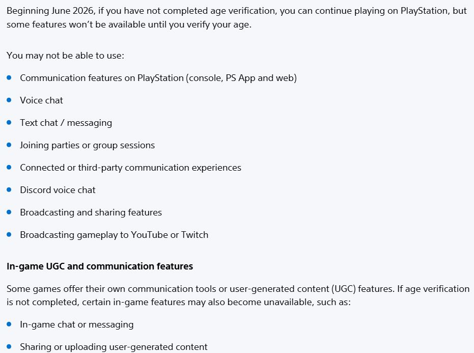 6월 이후 인증을 완료하지 않은 이용자는 음성 채팅, 문자 메시지, 파티 및 그룹 세션 참여, 디스코드 음성 채팅 연동 등 커뮤니케이션 기능 전반을 사용할 수 없게 된다. 유튜브·트위치 방송과 같은 방송·공유 기능도 제한된다.