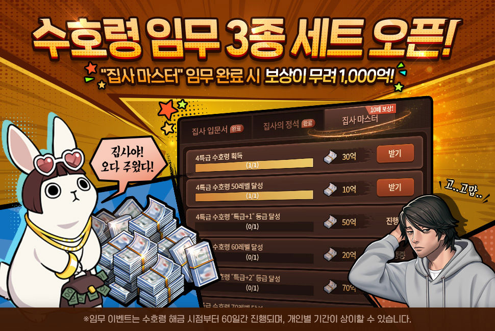 - 집사 마스터 임무 완료 시 보상 10배 지급하는 이벤트도 함께 진행