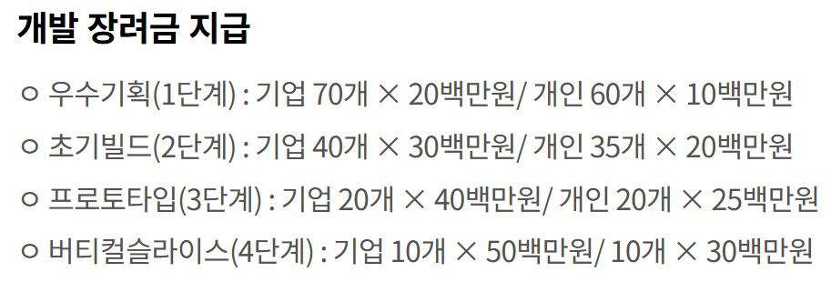 ▲ 기획, 초기빌드, 프로토타입, 버티컬슬라이스 총 4단계에 걸쳐, 지원 기업 및 개인의 수를 점차 줄여가고, 상위 단계까지 나아간 팀들에게 집중 지원하는 방식이다.