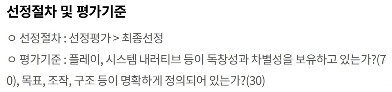 마찬가지로 명시된 평가기준도 "플레이, 시스템 내러티브 등이 독창성과 차별성을 보유하고 있는지"(70%), "목표, 조작, 구조 등이 명확하게 정의되어 있는지"(30%)로 '기획 의도의 창의성'을 보는 사항이 중점적이라 설명했다.