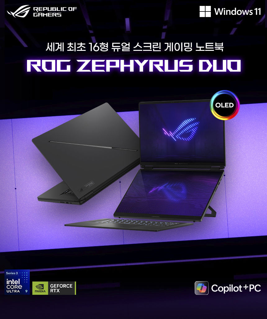이번 신제품 ROG 제피러스 듀오는 혁신적인 멀티 디스플레이 구조와 차세대 AI 성능, 강력한 그래픽 퍼포먼스를 결합해 게이머와 크리에이터 모두를 만족시키는 플래그십 모델이다. 듀얼 16형 3K OLED 터치스크린(2880 x 1800)을 탑재해 기존 노트북의 한계를 넘어선 작업 환경을 제공한다.