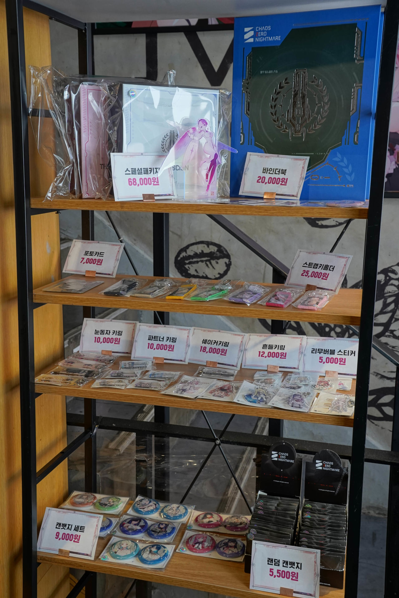 유저들이 구매할 수 있는 각종 굿즈들. 스페셜 패키지부터 바인더북, 키링, 캔뱃지 세트, 캐릭터로 꾸며진 장패드와 '아크릴 스탠드' 등이 준비되어 있다.