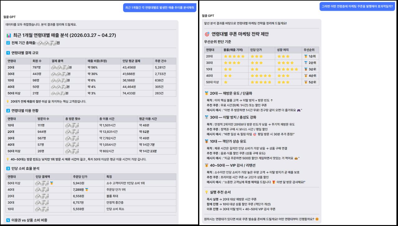 '월클 GPT'의 주요 특징은 '마케팅 연계 기능'과 '레포트 기능'이다. 우선 '마케팅 연계 기능'은 데이터 분석 결과를 바탕으로 즉시 쿠폰을 발행할 수 있는 기능이다. 예를 들어 "최근 1개월간 연령대별 매출 추이를 분석해 달라"는 질문에 대해 월클 GPT는 매장 내 데이터를 기반으로 분석 결과를 제시한다. 이어 "어떤 연령층에 마케팅을 진행하는 것이 효과적인가"와 같은 추가 질의 시, 연령대별 마케팅 우선순위를 도출하고 해당 타겟에 맞는 쿠폰 발행까지 연계할 수 있다.