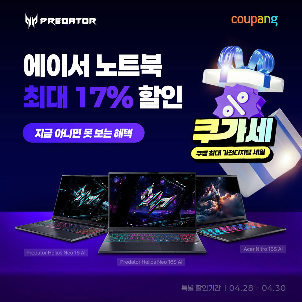 글로벌 PC 제조사 에이서(Acer)는 5월 10일까지 진행되는 쿠팡 '쿠가세(쿠팡 가전·디지털 세일)'에서 자사의 게이밍 및 라이프스타일 AI 노트북을 특별 할인 가격으로 선보인다.