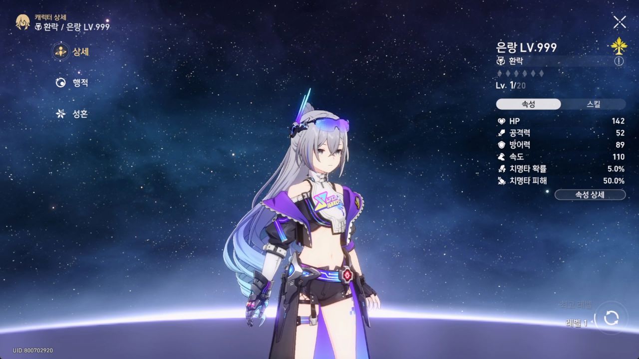 일단 먼저 공개된 '은랑 LV.999'는 주년 기념 캐릭터 답게, 초보자들도 사용하기 좋은 강 캐릭터로 등장했다. '환락' 운명의 길 메인 딜러이며, 특히 '비술'의 경우, 아예 전투를 스킵하는 기능을 들고나왔기 때문에 '시뮬레이션 우주', '차분화 우주' 등 이 게임에서 반복 플레이가 강제되는 콘텐츠를 획기적으로 빠르게 플레이할 수 있도록 도와준다.