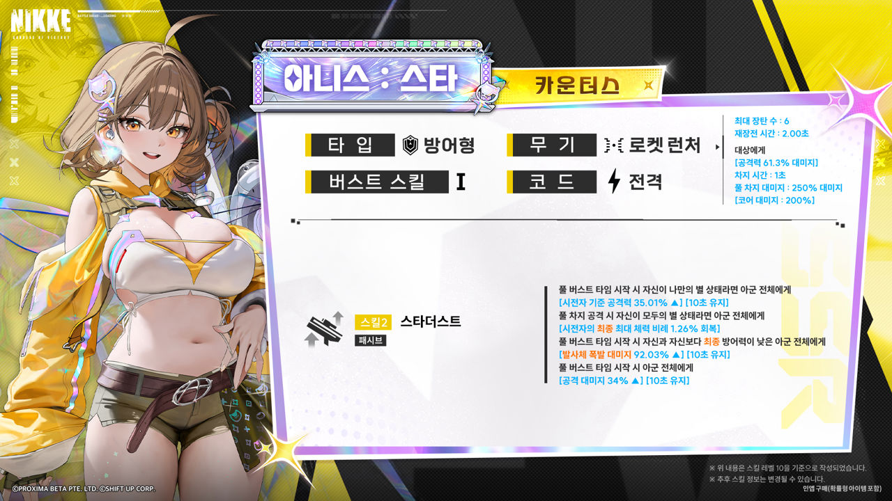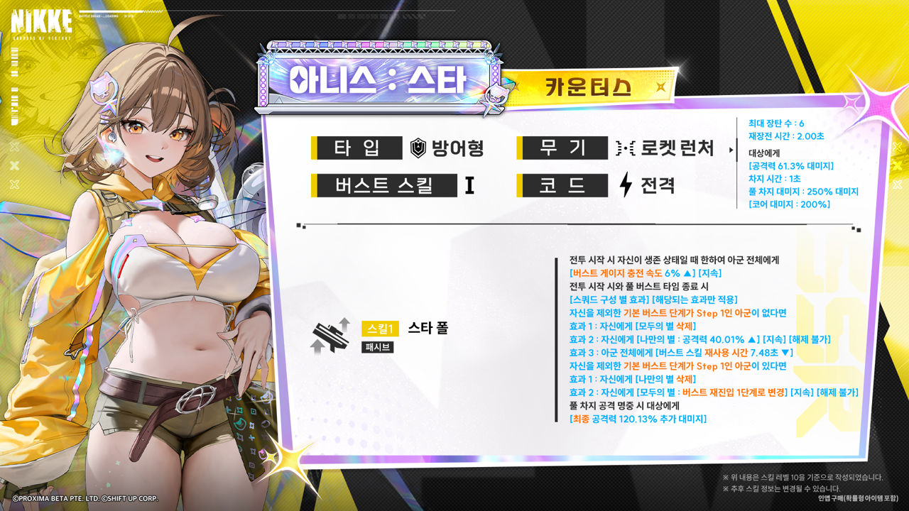 ※초보자든 고인물이든 무조건 추천: 결론적으로 '아니스 : 스타'는 현존하는 모든 니케를 통틀어서 1티어, 혹은 0티어로 손꼽히는 캐릭터다. 특히 과거 '리틀 머메이드'를 뽑지 않은 유저라면 반드시 뽑아야 할 이유가 있으며, 초보자는 물론이고 고수들도 뽑을 가치가 있다. 특히 '고스코어'를 노리는 유저라면 3돌파 이상도 추천된다.