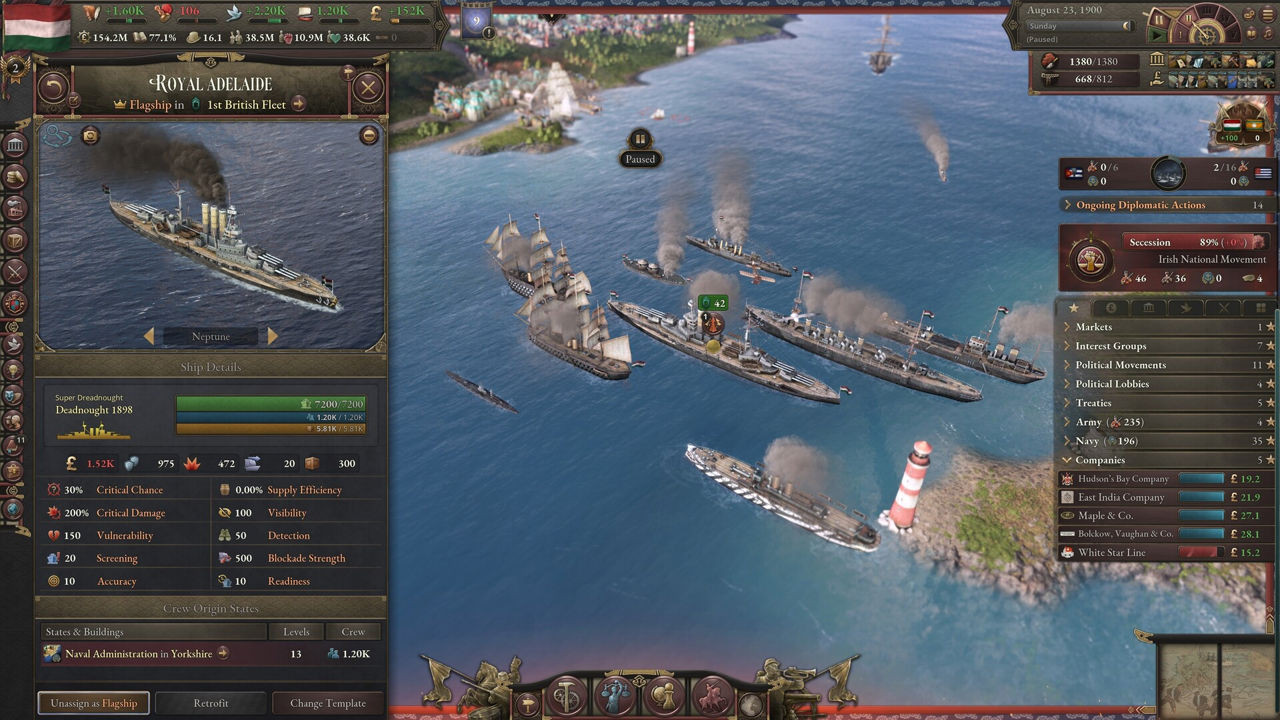 국가의 전략적 수요에 따라 함대를 설계하고 건조하라. 대양을 횡단하는 대양해군은 높은 비용이 요구되지만, 다른 국가에 영향력을 행사할 수 있는 강력한 투사 수단이다. 반면 연안해군은 연해 방어에 특화되어 있으며, 보다 효율적인 운용이 가능하다. 플레이어는 자신의 전략에 맞춘 군함을 설계할 수 있다.