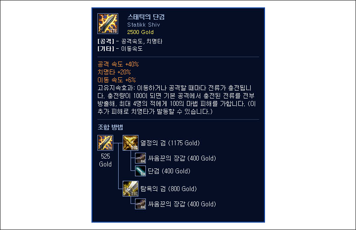 야스오의 패시브 스킬은 두 가지로 나뉘는데, 그중 하나가 치명타 확률을 두 배로 올려주는 효과다. 스태틱의 단검에 붙어 있는 치명타 20% 옵션은 야스오에게 40%로 적용된다.
