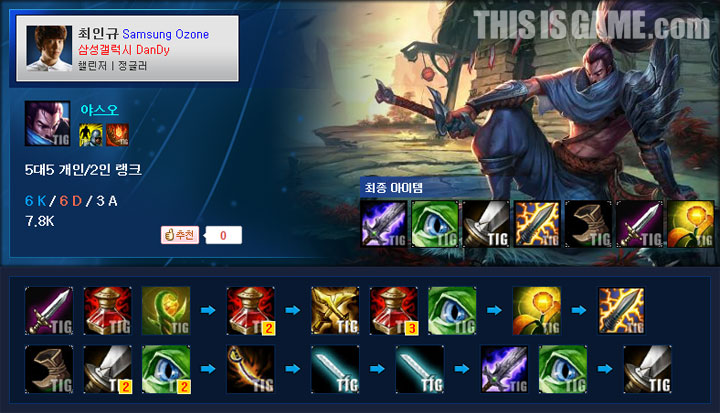 리그디스 프로빌드(www.thisisgame.com/lol/info/probuild/)에 등록되어 있는 댄디(DanDy) 선수의 미드 야스오 아이템 트리를 참고해 보도록 하자.