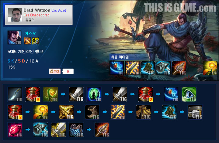 북미 팀 커스(Team Curse)의 정글러 원배드브래드(Onebadbrad) 선수는 야스오 출시 이후 꾸준히 정글러로 테스트를 해보고 있는데, 이 선수의 아이템 트리를 참고해 보도록 하자.