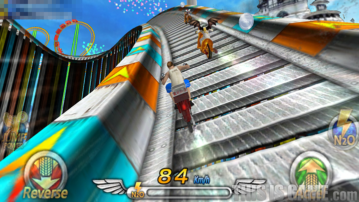 게임 2호 <스트리트 라이더 X: 풀 스로틀>: 모터 바이크를 타고 달리면서 점프하고, 트리키와 같은 기술까지 구사하는 레이싱게임. 레이싱 트랙부터 시가지, 대나무 숲 등 코스가 다양하며, 모바일 기기를 기울여서 바이크를 조종할 수 있는 조작 시스템도 눈에 띈다.