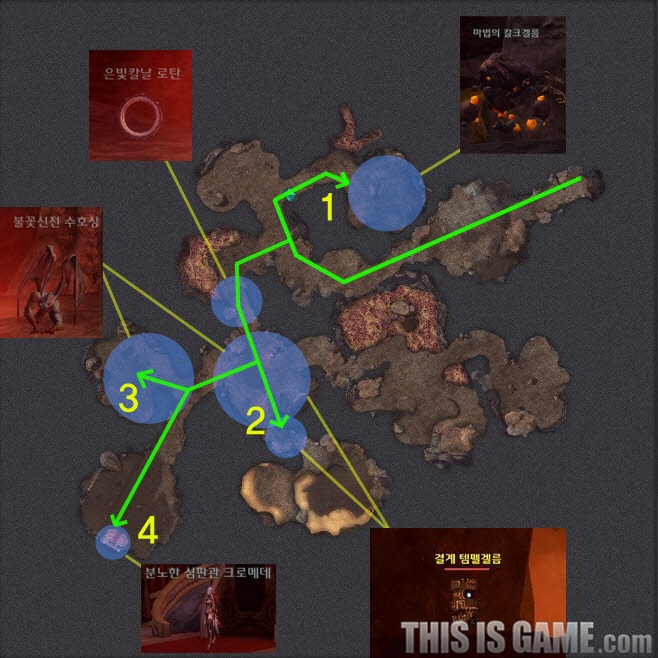 30레벨이 되면 우선 해당 퀘스트의 관련 NPC에게(천족 : 하그네, 마족: 플라먀) 반복 퀘스트 2종류를 받아두고 던전에 입장한다. 이후 불신에서 마법의 칼크겔름 2마리, 불꽃신전 수호상 5마리, 결계 템펠겔름 3마리를 잡은 뒤 곧바로 보스 크로메데를 잡으면 끝난다.