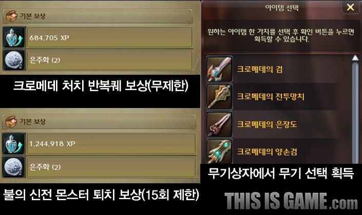 반복 퀘스트를 통해 얻는 은주화 보상 및 대량의 경험치, 심판관의 유일 무기 상자를 먹으면 무조건 원하는 무기를 선택 가능. 이것이 30레벨 = 불신 코스가 필수인 이유