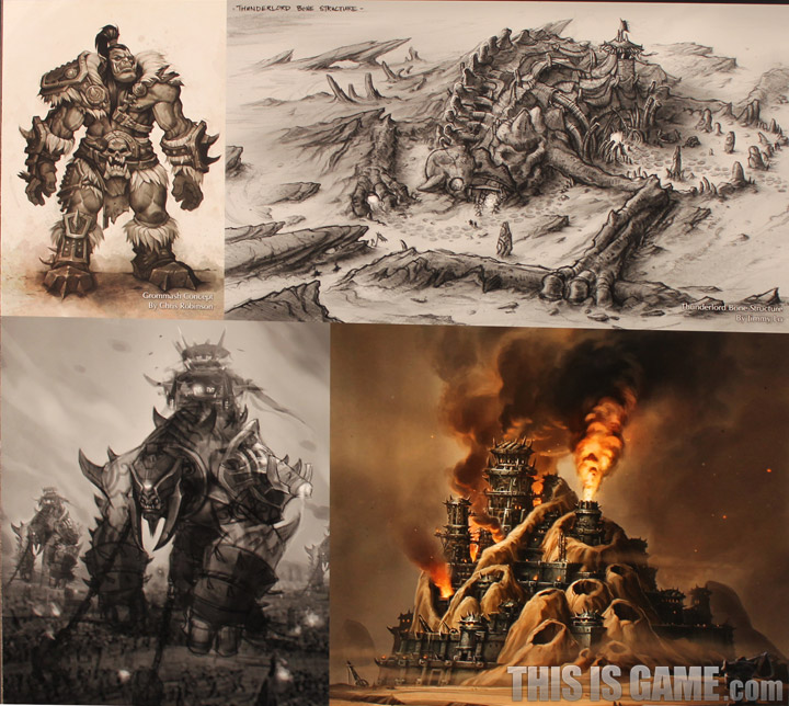 마지막으로 18일 출시를 앞두고 있는 <드레노어의 전쟁군주> 콘셉트 아트입니다. 산 하나를 통짜로 깎아 제련소를 만든 이미지나 강철호드가 끌고 다는 초대형 생물체 등 사전 예고 영상에서 등장했던 요소들의 초기 모습이 담겨 있네요. 이번 확장팩에서 변화한 각 종족의 새로운 외형도요,