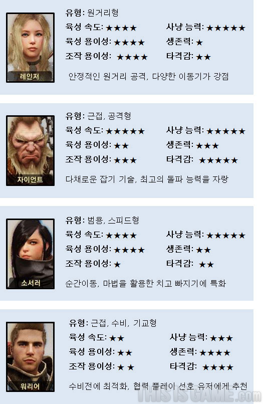 A. 현재 레인저, 자이언트, 소서러, 워리어 총 네 종류의 캐릭터가 준비돼 있습니다. 간단한 캐릭터 소개 및, 3차 클로즈 베타 테스트(이하 CBT) 당시 평가를 확인해보시죠.