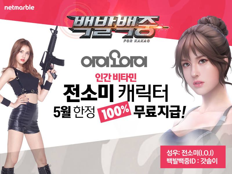 넷마블은 전소미 캐릭터 출시를 기념한 영상을 <백발백중> 페이스북에 공개하고, 친구를 게임에 초대하면 전소미 캐릭터를 무료로 지급하는 이벤트를 5월 31일까지 실시한다. 또, 백발백중은 아이오아이의 광고모델 발탁을 기념해 오는 19일까지 게임에 접속하면 101개 다이아를 증정하는 이벤트를 매일 진행한다.
