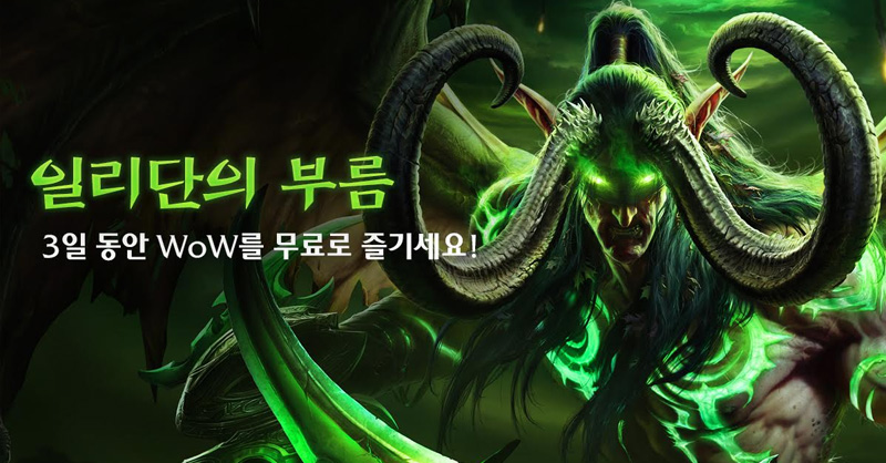 블리자드 엔터테인먼트(Blizzard Entertainment, Inc. www.blizzard.com)는 금일 자사의 MMORPG <월드 오브 워크래프트>의 한국 플레이어들만을 위해 마련된 특별한 한시적 혜택인 ‘일리단의 부름’을 발표, 여섯 번째 확장팩 <월드 오브 워크래프트: 군단>(World of Warcraft®: Legion™)이 한국에서 정식 출시되는 9월 1일(목)부터 3일(토)까지 이를 무료로 플레이할 수 있다고 밝혔다.