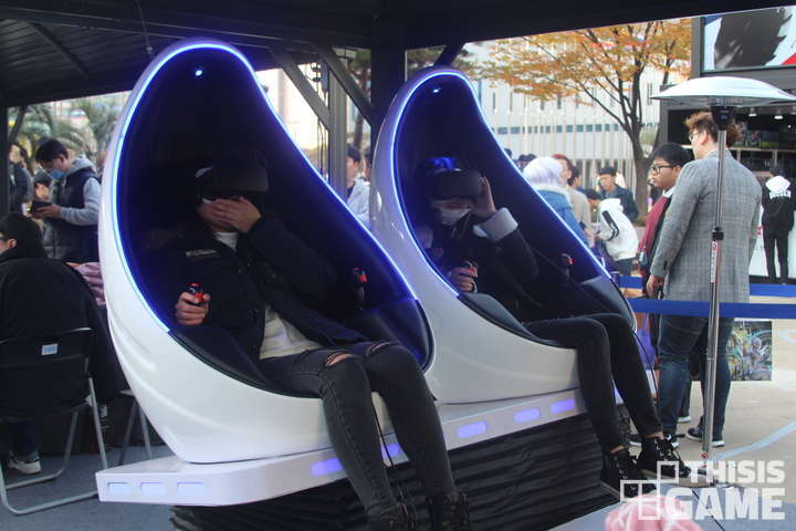 엠게임의 PC 온라인게임 <열혈강호 온라인>의 IP를 활용한 VR 대전 게임 <열혈강호 액션 VR>과 메카닉 대전 액션 게임 <프로젝트 X>를 시연하기 위해 많은 유저들이 엠게임 부스를 방문했다. 이외에도 롤러코스터와 바이킹을 재현한 탑승형 VR 2종도 함께 선보인 엠게임 부스의 전경을 사진으로 담아봤다. /디스이즈게임 김지현 기자