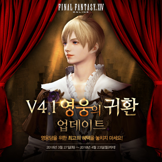 <파이널판타지14>의 V4.1 ‘영웅의 귀환’ 업데이트 및 역대급 혜택을 제공하는 프로모션 이벤트에 대한 자세한 소식은 공식 홈페이지를 통해 확인할 수 있다.