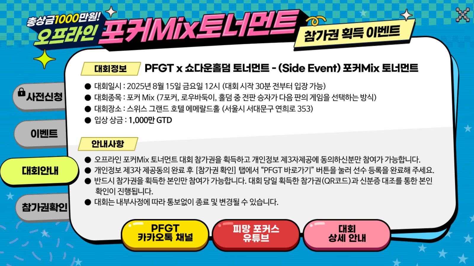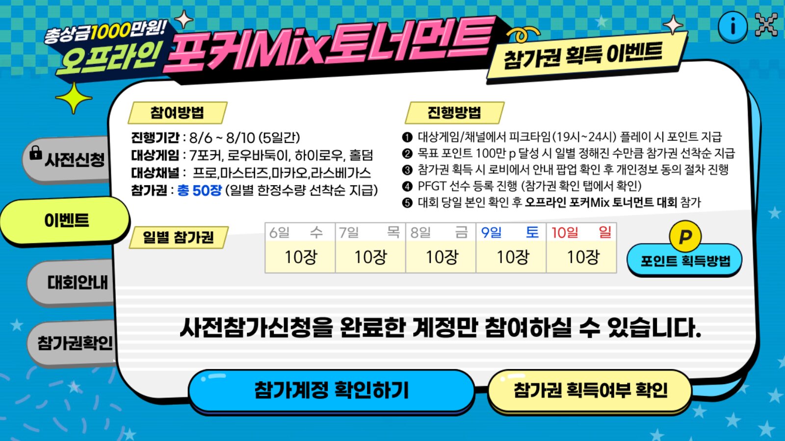 지금 피망포커에선 한참 Mix 토너먼트가 진행 중이라 사람들이 많이 몰리고 있는더라고요 물론 이건 사전 참가신청을 했어야 포인트도 모으고 참가권도 얻을 수 있는데 피크타임에 플레이해서 참가권 획득하는 분들은 얼마나 초고수 일지... 오프라인 대회도 열리는 거라 사실 구경 같은 거만 해도 너무 재밌을 거 같죠