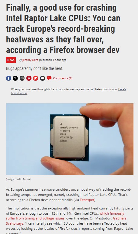 인텔 13~14세대 CPU가 유럽 폭염으로 대량 다운, 파이어폭스 개발자가 크래시 리포트로 폭염 지역 추적 중 원래 타이밍/전압 문제 있었는데 더위 + 기존 결함 = 게임 중 강제 셧다운 콤보 완성 인텔 마이크로코드 패치는 임시방편일 뿐, 근본 해결하려면 성능 대폭 포기해야 함