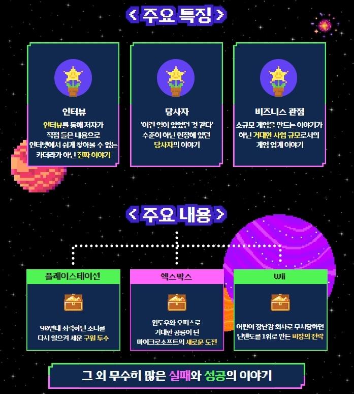 90년대 쇠락하던 소니의 새로운 돌파구가 되어준 ‘플레이스테이션 2’와 윈도우로 세계적인 기업이 된 마이크로소프트의 새로운 도전인 ‘엑스박스’. 그리고 어린이 장난감 회사로 무시당하던 닌텐도를 세계 1위로 올린 ‘Wii’까지 게이머에게 친숙한 콘솔들의 탄생 비화를 소개합니다.