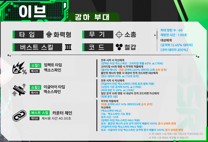 이브는 '자기 자신의 버프'에 집중한 딜러입니다. 주목해 볼만한 점은 1스킬 덕분에 자체 크리티컬 확률을 75%까지 확보할 수 있다는 점인데요. <승리의 여신: 니케>는 크리티컬 확률의 효율이 (지금까지는) 좋지 않은 게임이기 때문에, 크리티컬 관련 큐브나 여러 옵션들이 무시되는 경향이 있었는데 이런 것들이 활용될 수 있을 것으로 보입니다. 하지만 스킬 계수가 그렇게 까지 높지 않고, 버스트 스킬이 '순차 스킬' 이라 말 그대로 전장을 지배하는 수준이라고 하기는 어렵습니다.
