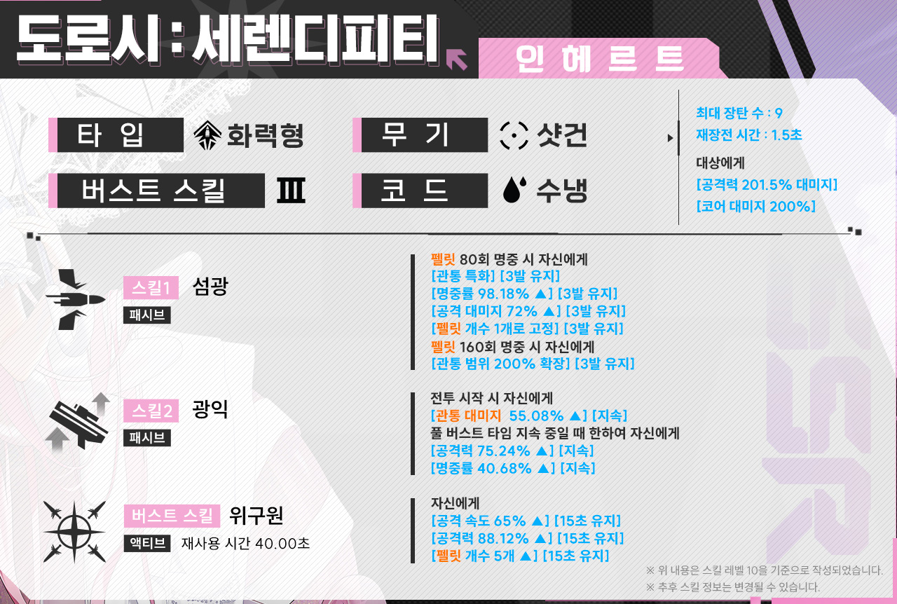 먼저 '도로시 : 세렌디피티'는 수냉 코드의 '샷건' 3버스트 딜러 캐릭터다. 원본은 1버스트지만 딜러의 역할을 한다는 콘셉트였던 반면, 이번 신 캐릭터는 순도 100% 3버스트 딜러 캐릭터로 등장했다는 것이 특이한 점. 여기에 중요한 것은 이 캐릭터가 '한정' 이면서도 '필그림' 이라는 점이다.