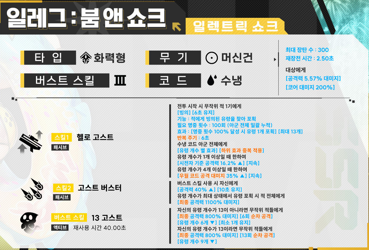 7월 24일부터 픽업을 시작한 '일레그 : 붐 앤 쇼크'는 3버스트 수냉 코드 '머신건' 딜러 캐릭터다. 기본적으로 3버스트에 강력한 DPS 능력을 갖춘 딜러지만, 실제로는 '딜러' 역할 못지 않게 '타수' 중심 덱에 강력한 버프를 주는 '버퍼' 로서의 역할도 눈길이 가는 캐릭터다.