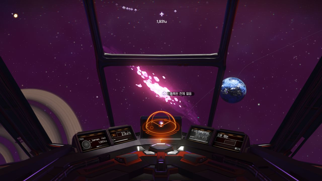 행성 대기권에 진입했지만, 구름이 짙어 대지는 보이지 않는다.